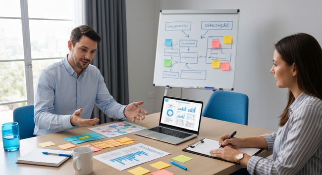 Na fase de Consultoria, inicio com perguntas essenciais como “Quais são os maiores desafios do seu negócio atualmente?”, “De que forma você avalia o sucesso?” e “Quem representa seu cliente ideal?”. Para reunir informações valiosas, aplico entrevistas estruturadas, examino documentos internos e realizo pesquisas de mercado. No momento do Diagnóstico, comparo esses dados com referências do setor e analiso os concorrentes diretos para identificar tanto oportunidades quanto riscos. Durante a Análise, reúno tudo em mapas de empatia e análises SWOT, ajustando o briefing com hipóteses estratégicas bem definidas. Esse método assegura que cada solução proposta esteja verdadeiramente alinhada às necessidades do cliente, tornando o planejamento muito mais preciso e eficaz.